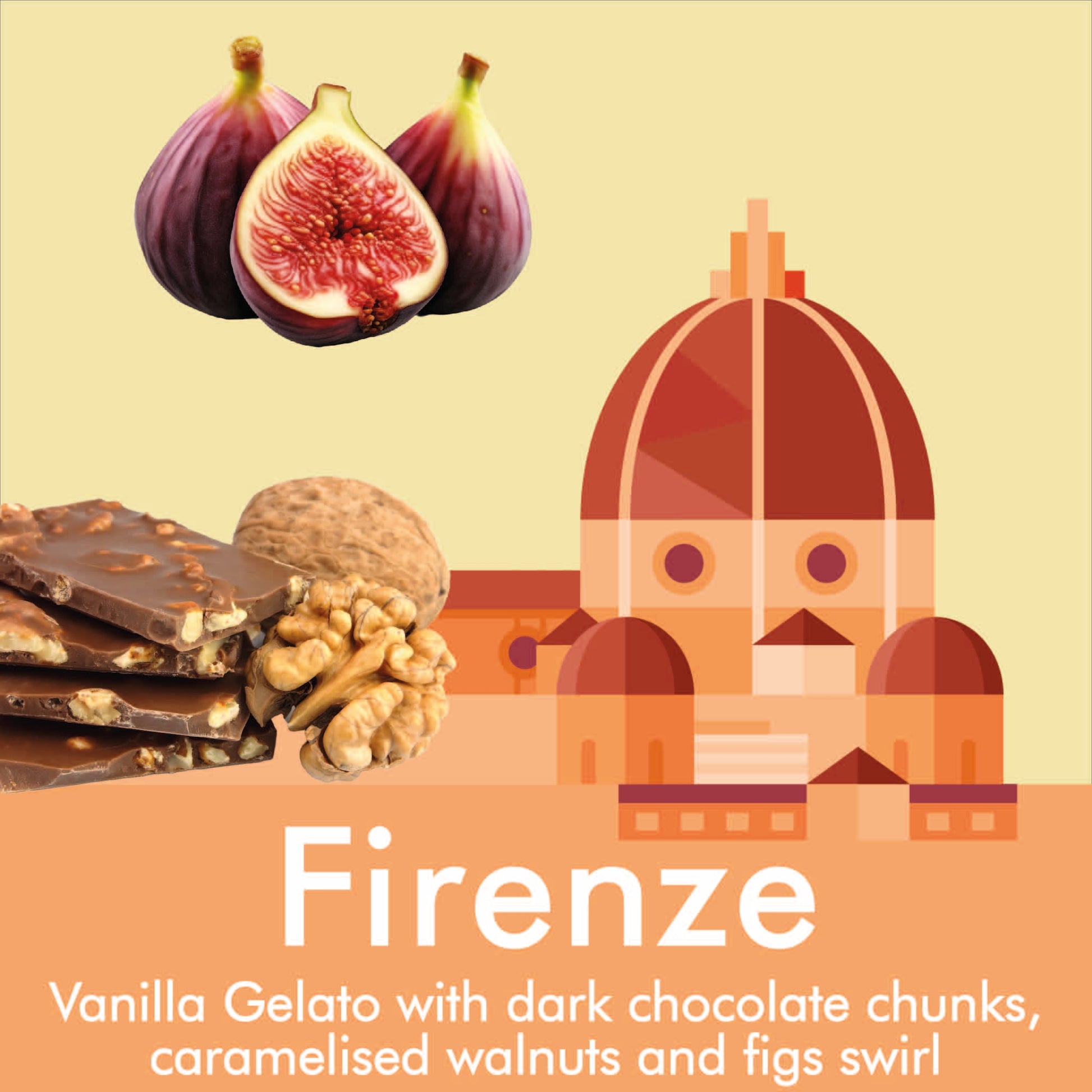 Madagascar vanilla Gelato with chunks of organic dark chocolate and caramelised walnuts, completed by a homemade figs swirl. Inspired by Florence, the biggest town in Tuscany, and the most famous ingredients of this region.